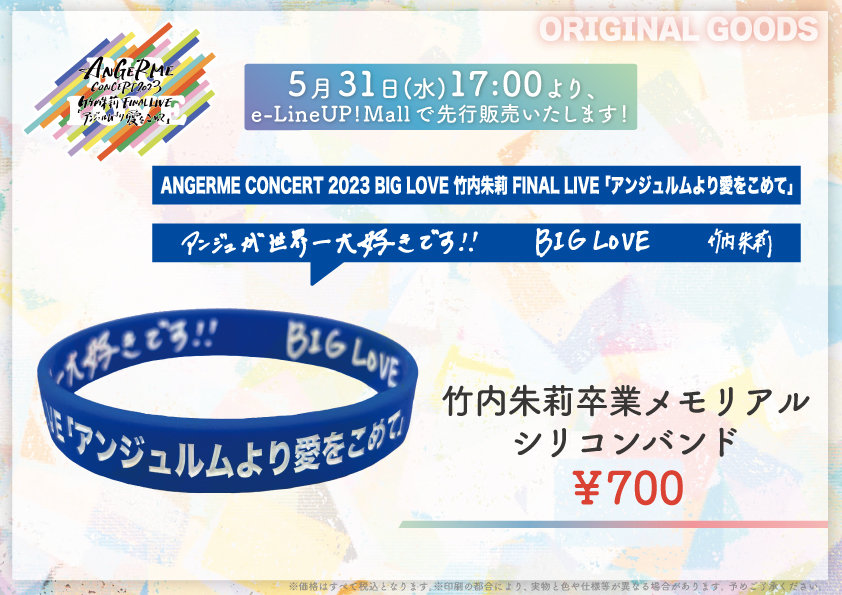 6/21(水)ANGERME CONCERT 2023 BIG LOVE 竹内朱莉 FINAL LIVE「アンジュルムより愛をこめて」公演に先駆けて、5/31(水)17:00より、Tシャツ、シリコンバンド、ソロマフラータオル、ソロジャンボうちわをe-LineUP!Mallで先行販売いたします!