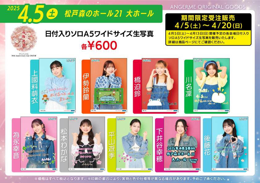 4/5~4/13開催予定の各会場の日付入りソロA5ワイドサイズ生写真を販売いたします。