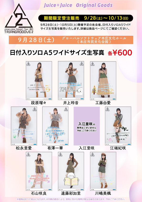※9/28~10/5開催予定の各会場の日付入りソロA5ワイドサイズ生写真を販売いたします。