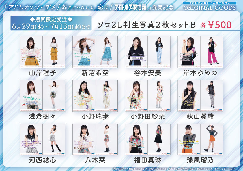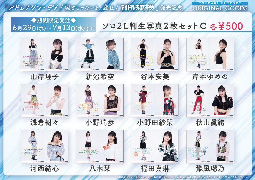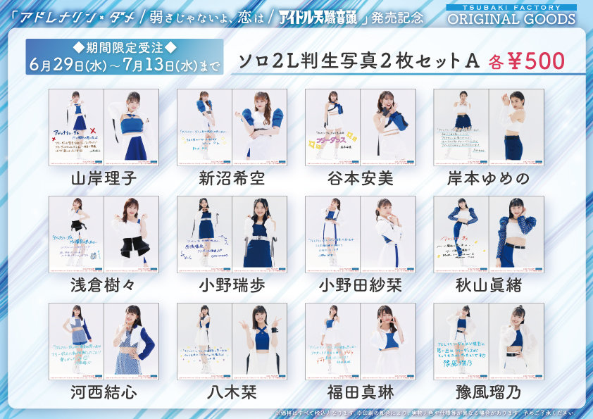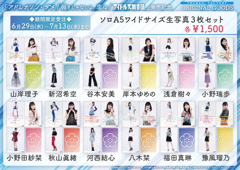つばきファクトリー 9thシングル「アドレナリン・ダメ/弱さじゃないよ、恋は/アイドル天職音頭」発売記念グッズを期間限定で受注販売いたします。